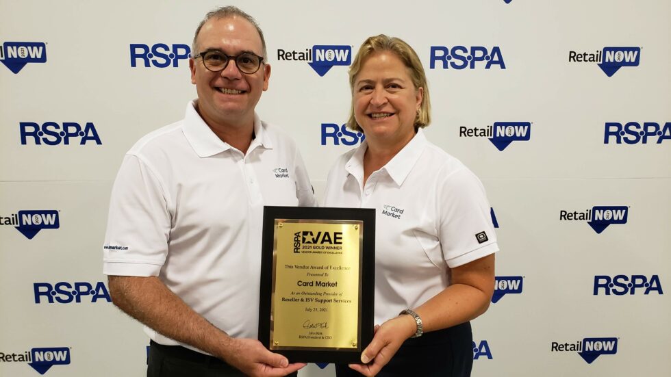 Card Market is thrilled to have been recognized with the “Gold Award for Vendor Excellence” at the 2021 RetailNOW trade show in Nashville, Tennessee, hosted by The Retail Solutions Providers Association (RSPA). The award was received by Card Market’s Mark Miller, VP of Sales & Marketing, and Angela Votta, VP of Customer Care.